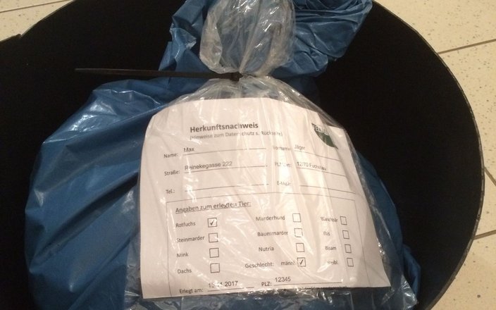 Die Tierkörper sollten nach der Erlegung möglichst schnell und platzsparend verpackt und unbedingt mit dem Herkunftsnachweis versehen werden. Dieser garantiert eine lückenlose Dokumentation. Es empfiehlt sich, einen mittelgroßen Eimer mit einem Plastiksack auszukleiden und das erlegte Tier eingerollt hineinzulegen (ähnlich der natürlichen Schlafposition des Tieres). So stehen die Branten nach innen und beschädigen den Sack nicht. Dann sollte der Sack möglichst eng verschlossen werden. Der ausgefüllte Herkunftsnachweis sollte in eine durchsichtige Plastiktüte gesteckt werden, sodass von außen sofort erkennbar ist, um welches Tier es sich handelt. Beides - verpackter Tierkörper und Herkunftsnachweis - werden mit einem Kabelbinder verbunden und verschlossen und in der nächsten Sammelstelle oder in der eigenen Gefriertruhe eingefroren. So wird das kleinste Pack- und Lagermaß erreicht.