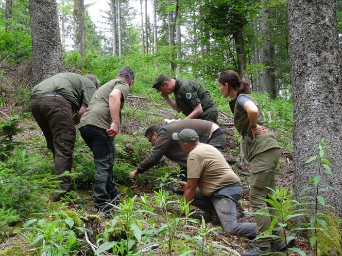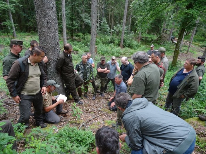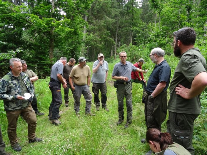 Eingeteilt in Vierergruppen sollten die Seminarteilnehmenden an vier Ausbildungsstationen vor Ort die Anschussstelle bestimmen und auf Pirschzeichen untersuchen. Gesucht wurde nach Merkmalen am Boden und im Grünen, wie zum Beispiel Eingriffe, Kugelschlag sowie vom Stück stammende Teile (Knochen- und Gewebeteilchen, Schwarte, Decke, Borsten und dergleichen) – und natürlich auch nach Schweißspuren. Mit diesem Wissen wird der Jäger später am Ort des Geschehens in der Lage sein, Pirschzeichen und Fährten lesen und verstehen zu können.