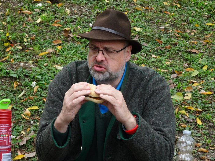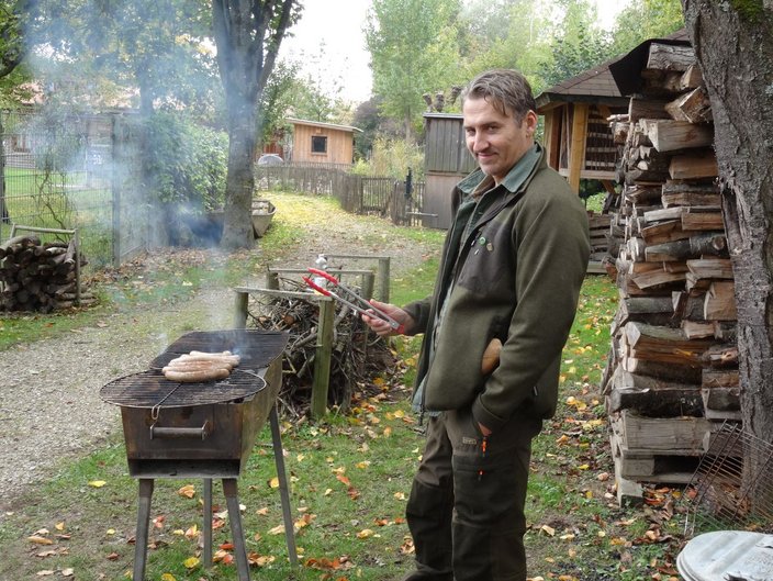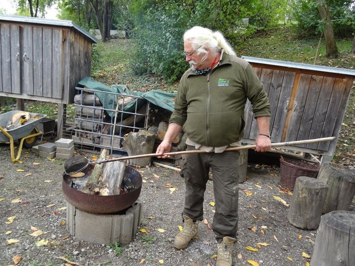 Für das Mittagessen wurde ein Feuer entfacht und auf dem Grill hervorragende Wildschweinwürstchen zubereitet. Auch Popcorn über dem Feuer zubereitet wurde uns serviert! Ein Dank an dieser Stelle an unseren Grillmeister Peter Bux - im Hauptberuf zertifizierter Waldpädagoge und Leiter der Pädagogik im Naturzentrum! Vom Grillplatz aus hatten wir einen guten Überblick über den an das Naturzentrum angrenzenden Teich. Dort zeigte sich wie in einem Brennglas die Veränderungen im Bereich der Population der Wildtiere: über 30 Kanadagänse, drei Nilgänse, zwei Blässgänse, wenige Stockenten und vier Kormorane.