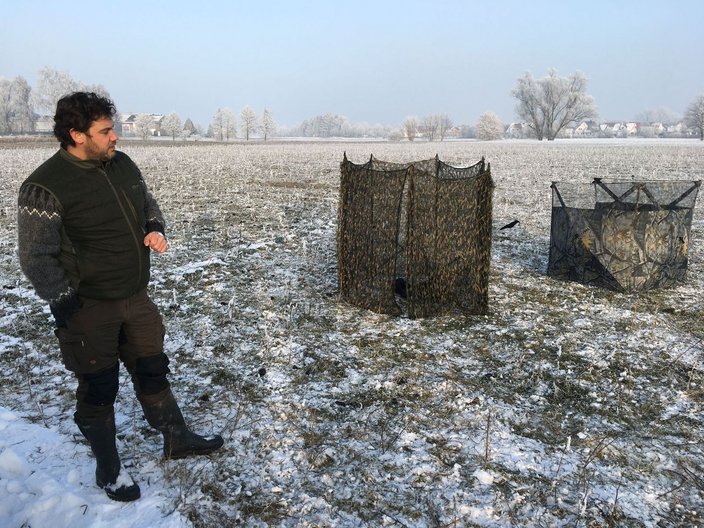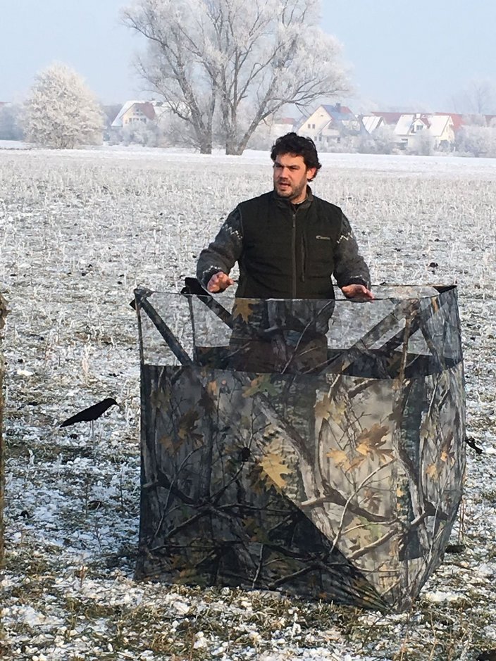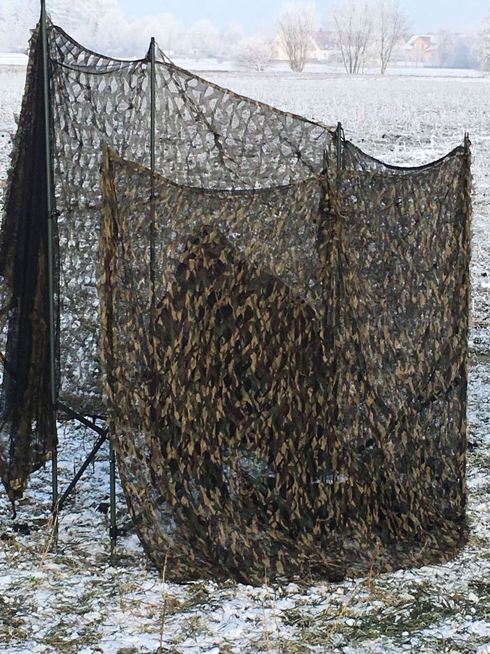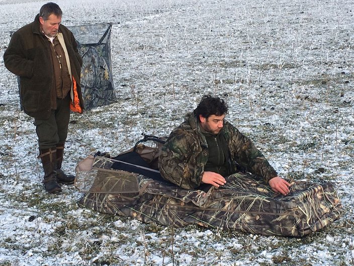 Anders als die Krähen fliegen Enten und Gänse immer mit dem Wind ein. So sind die Positionierung der Schützen bei der Enten- oder Gänsejagd und die richtige Aufstellung des Lockbildes besonders wichtig. Bei sich ändernden Windverhältnissen sei die Aufstellung des Lockbildes in X-Form mit den Schützen im Schnittpunkt besonders geeignet, um auf andere Windrichtungen zu reagieren. Auch hierzu stellte Markus Laiblin die liegende „Ansitz“möglichkeit in einem bequemen Liegesack vor.