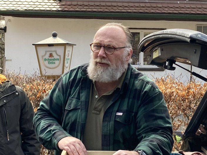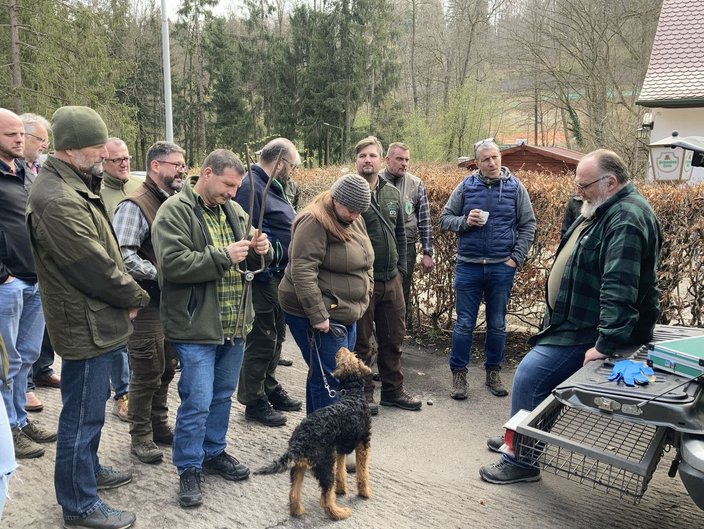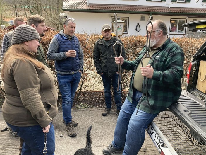 An seinem „Einsatzfahrzeug“ erklärte Uwe König was er bei seinen Einsätzen so alles mit sich führt, um seine Arbeit sorgfältig, waidgerecht (JWMG: nach aktuellem Stand der Technik), ethisch und tierschutzkonform durchführen kann ohne auf die eigene Sicherheit zu verzichten, durchzuführen. Zahlreiche Fragen der Teilnehmer, die in die verschiedensten Richtungen gingen unterbrachen die Erläuterungen der Referenten; so wurde es ein langer Tag, der in diesem Umfang nicht geplant war.